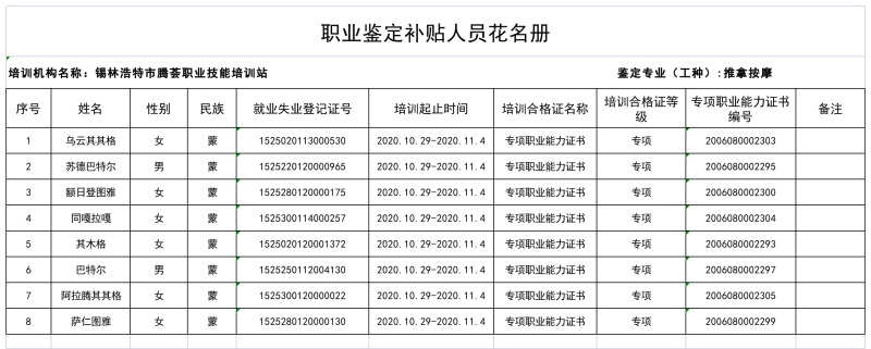 2020年11月21日,锡林浩特市腾荟职业技能培训站对锡林郭勒盟民族高级技工学校《推拿按摩》培训学员进行了职业技能鉴定,鉴定后合格人数为8人。为增加鉴定工作的透明度,现将鉴定补贴人员名单进行公示。