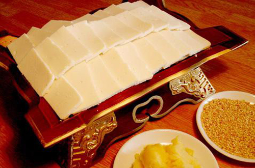 奶豆腐:是蒙古族最常见的奶食品之一。制做方法是将酸奶子放在锅中经慢火熬煮,放入布袋挤压而成。奶豆腐有酸味、甜味不等,依主人的口味采用不同方法而制成。
