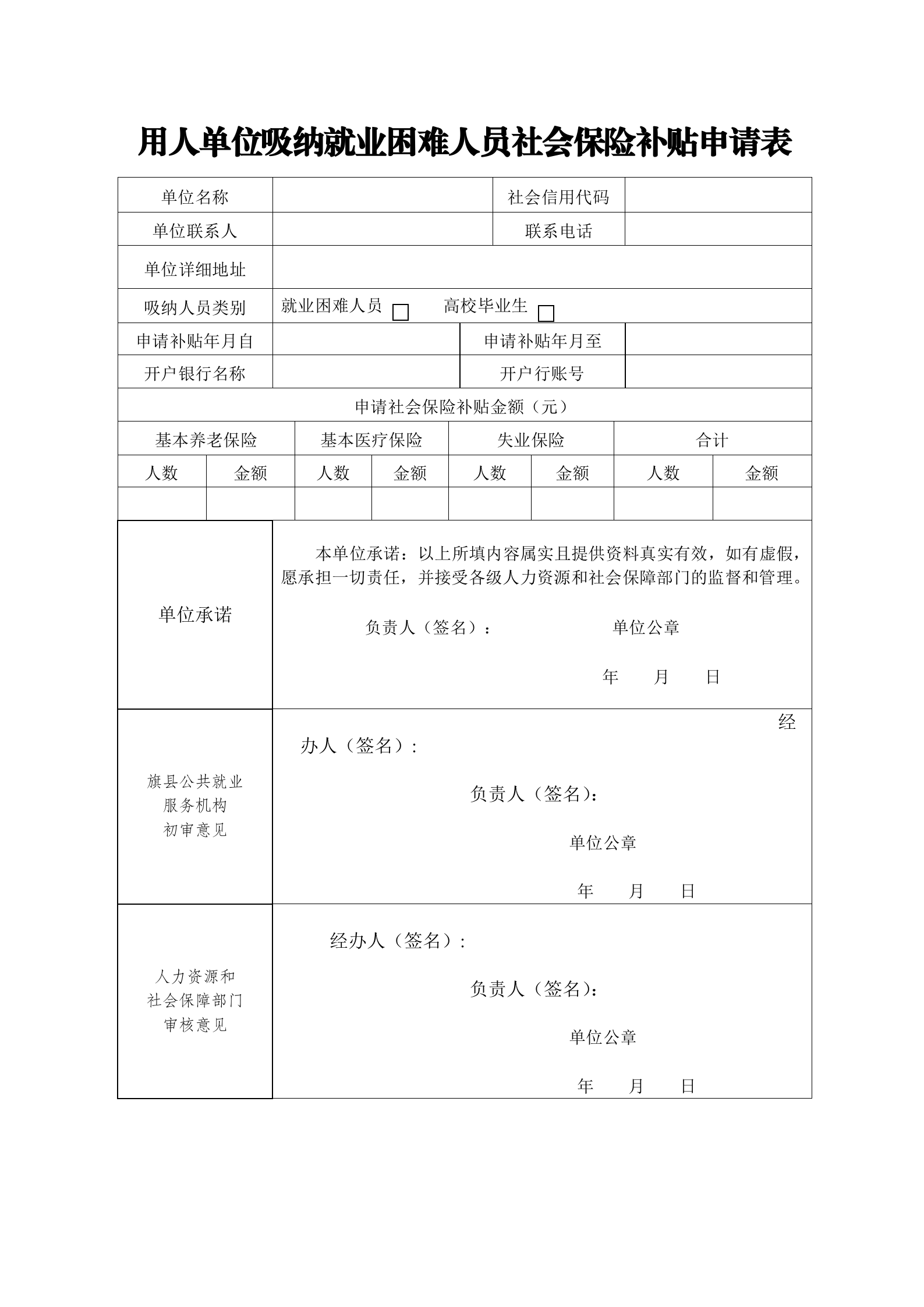 用人单位吸纳就业困难人员社会保险补贴申请表