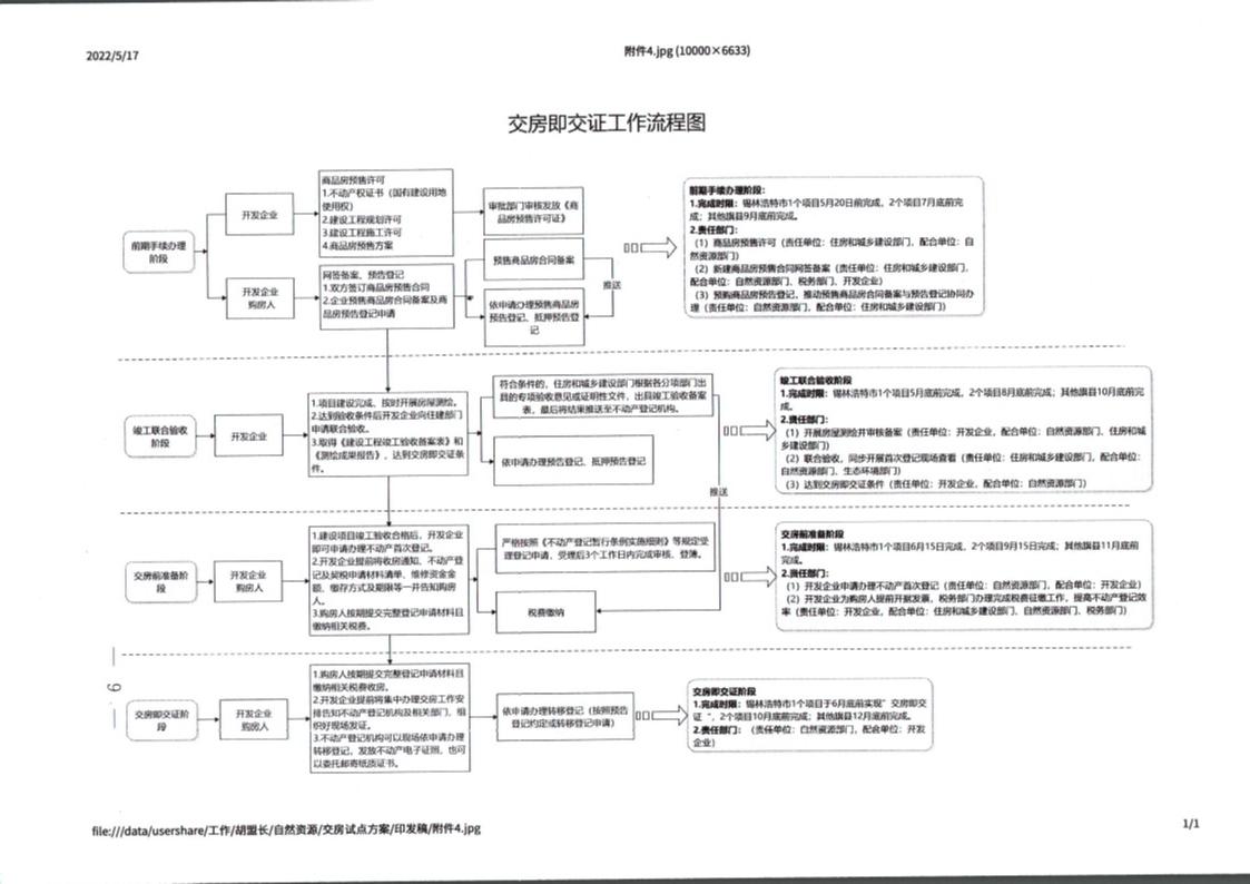 各旗县市(区)人民政府(管委会)对本地区新开发的楼盘项目 进行梳理,符合登记条件、完成缴税的楼盘项目,均可做为“交房即 交证"项目,对具备“交房即交证"的开发企业办理首次登记、过户 转移登记、缴交税费等业务时,自然资源、住房和城乡建设、税务部 门加强工作协同,实行合并办理,压缩时限,实现在新建商品房交 房现场为购房人颁发不动产权证书。锡林浩特市选择3个项目进 行试点,1个项目于6月底前实现“交房即交证”,2个项目10月底 前完成;其他旗县(区)原则上至少选择1个项目进行试点,力争年底前取得实效,实现“交房即交证”。
