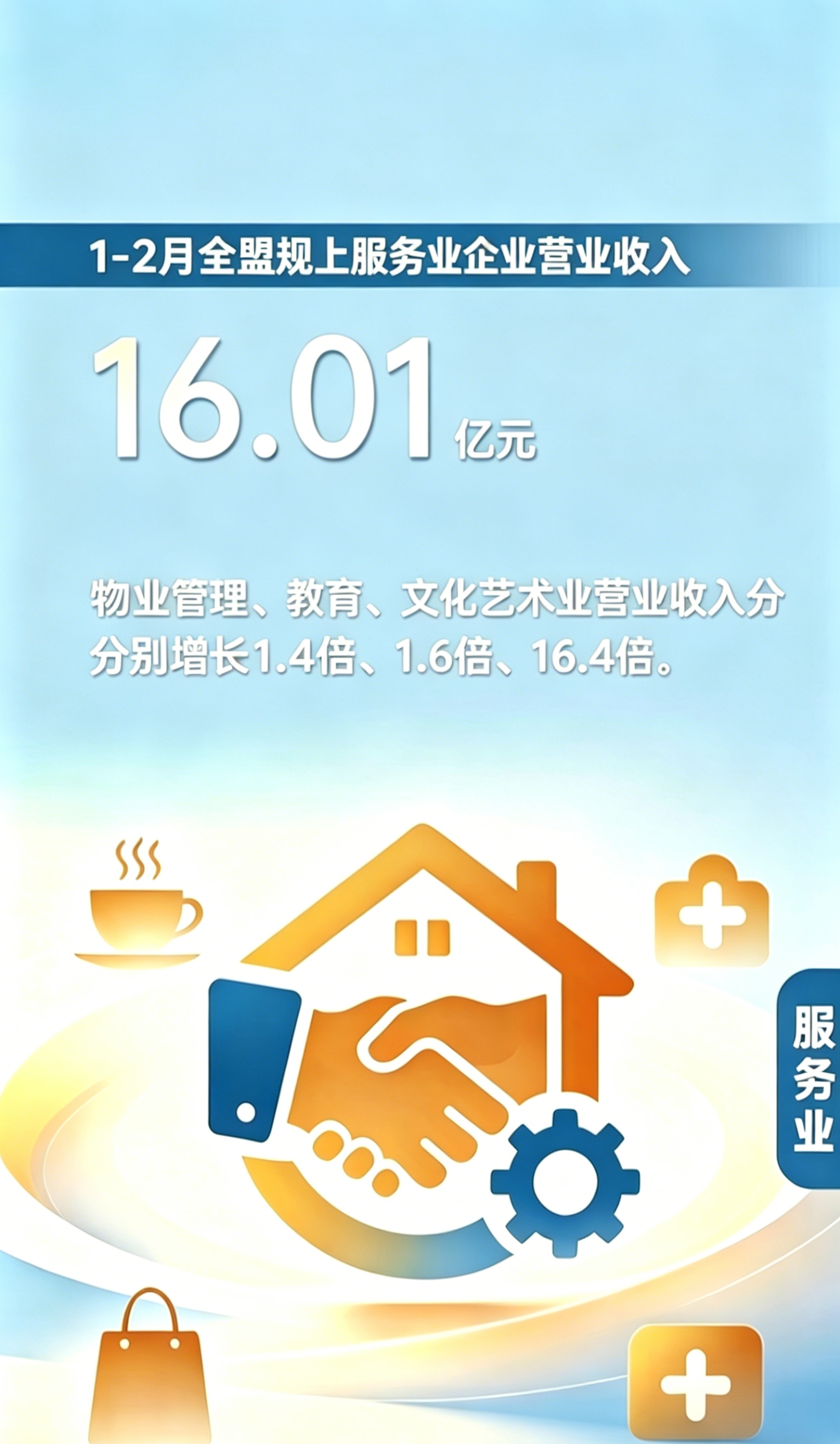 部分行业成倍增长,租赁业拉动有力。1-2月,全盟规上服务业企业营业收入16.01亿元。其中,物业管理、教育、文化艺术业展现出强劲增长动力,营业收入增速分别高达1.4倍、1.6倍、16.4倍,合计上拉规上服务业增速1.3个百分点。租赁业营业收入1.26亿元,同比增长22.5%,上拉规上服务业增速1.3个百分点。