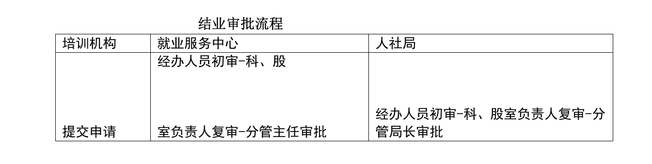 结业审批:企业或培训机构(含职业院校、技工院校)、线上培训平台,按照教学计划完成规定课时并组织结业考试后,应继续向经办机构提出结业申请,由经办机构进行审批。