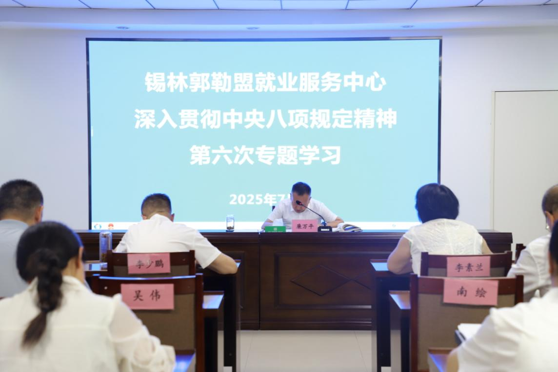 为深入贯彻落实中央八项规定精神学习教育相关要求,7月25日,锡林郭勒盟就业服务中心召开深入贯彻中央八项规定精神第六次专题学习会,中心主要负责同志主持会议,全体干部职工参会学习。