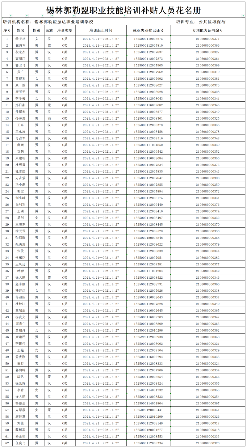 2021年4月21日—27日,锡林郭勒盟振达职业培训学校为正在领取失业保险金的失业人员开展了《公共区域保洁》培训班,培训后合格人数为62人。为增加培训工作的透明度,现将培训补贴人员名单进行公示。