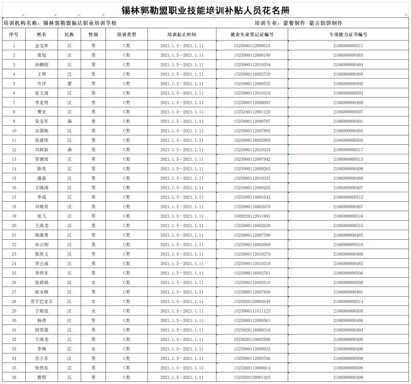 附件:锡林郭勒盟职业技能培训补贴人员花名册