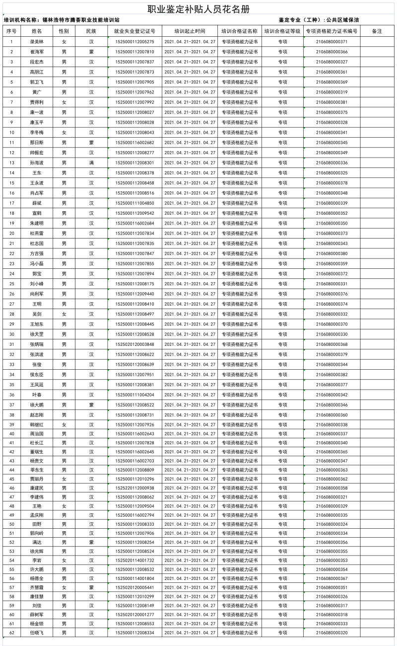 2021年5月21日,锡林浩特市腾荟职业技能培训站对锡林郭勒盟振达职业培训学校《公共区域保洁》培训学员进行了职业技能鉴定,鉴定后合格人数为62人。为增加鉴定工作的透明度,现将鉴定补贴人员名单进行公示。