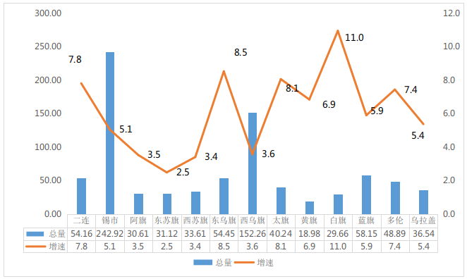 分地区看,全盟13个县域中,2地区第一产业增加值增速呈两位数增长,分别为多伦县(10.6%)和白旗(10.5%);其余4个高于全盟平均水平的地区依次是西苏旗(8.5%)、二连浩特市(8.3%)、太旗(7.0%)和蓝旗(6.7%);7地区增速低于全盟平均水平,依次是锡林浩特市(6.1%)、西乌旗(5.8%)、东乌旗(4.9%)、东苏旗(4.8%)、黄旗(4.2%)、乌拉盖(4.1%)和阿旗(3.9%)。